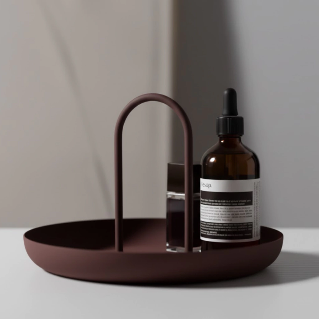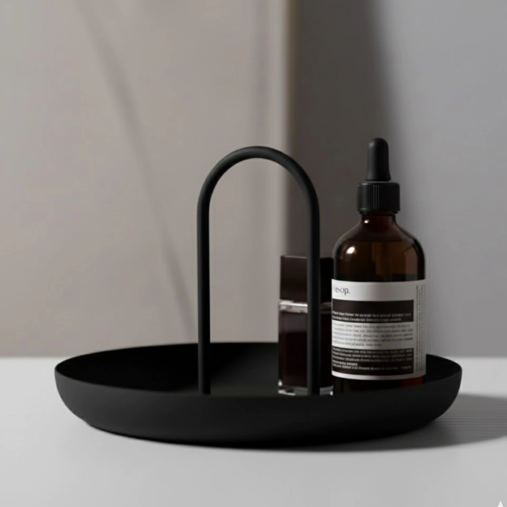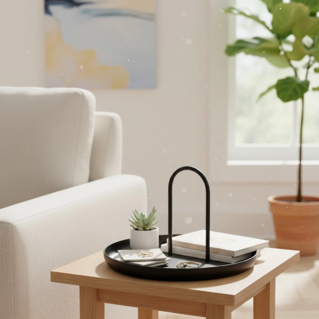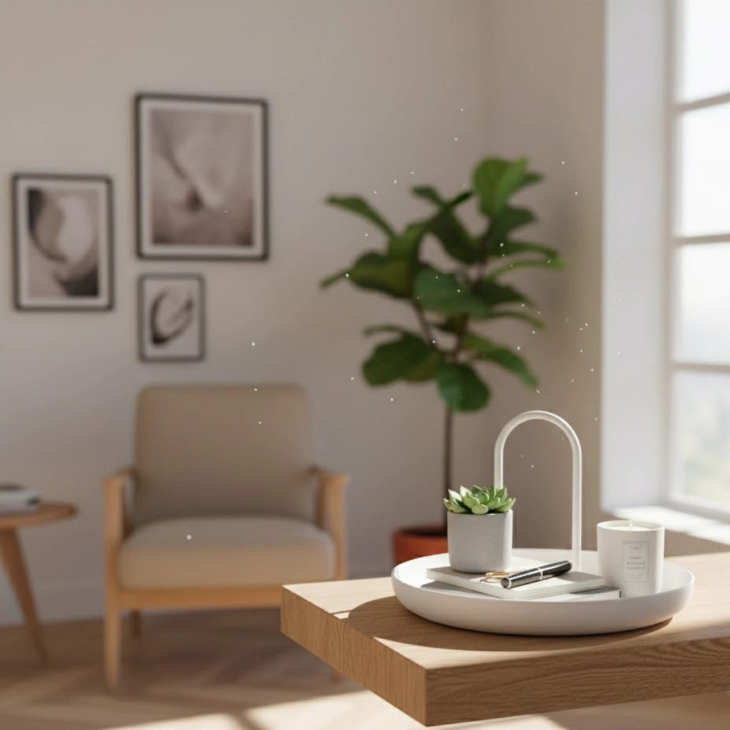 Exhibición de Velas/Aromas: Agrupa varias velas pequeñas o un difusor con aceites esenciales para crear un centro de mesa cohesivo y fácil de mover.