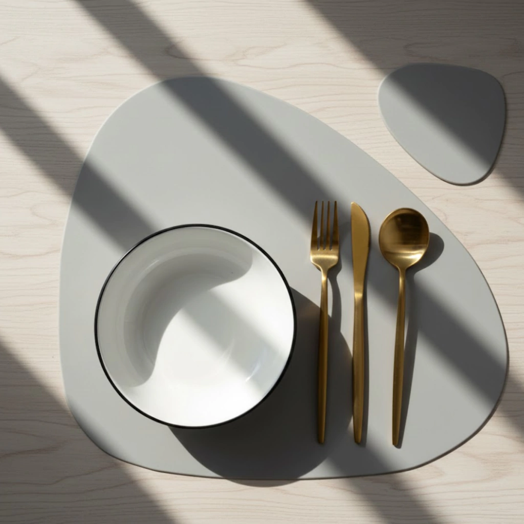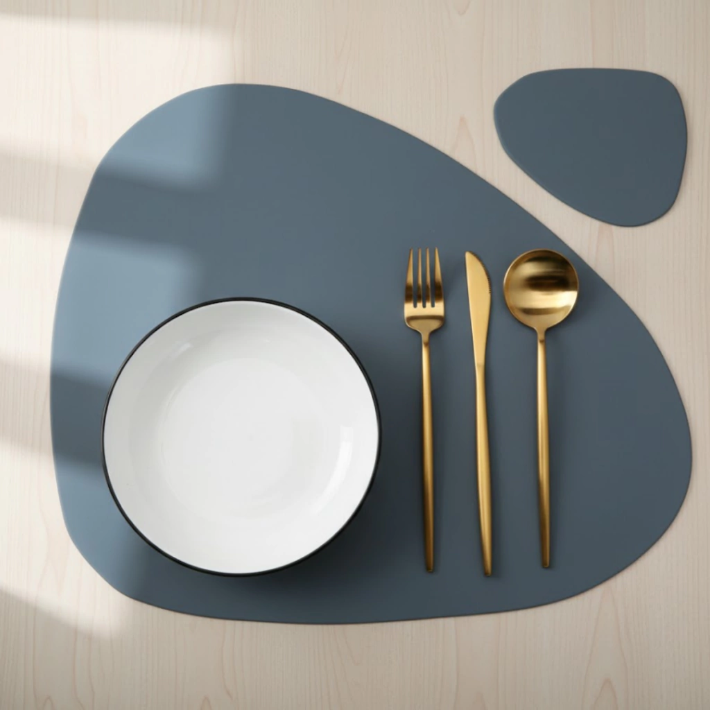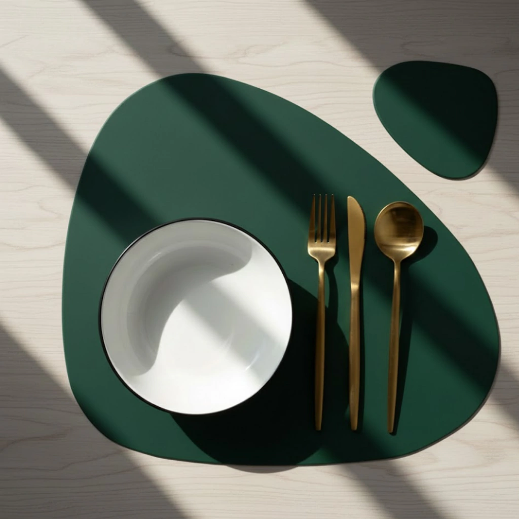 Materiales: Individual y posa vaso fabricados en cuerina flexible de alta calidad. Su textura suave y antideslizante asegura firmeza sobre la mesa y evita que los objetos se desplacen. Resistentes al calor, impermeables y fáciles de limpiar.