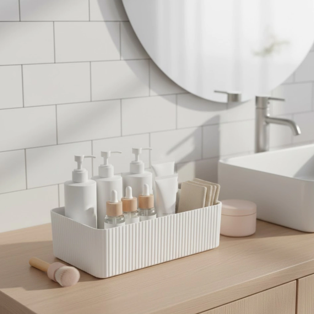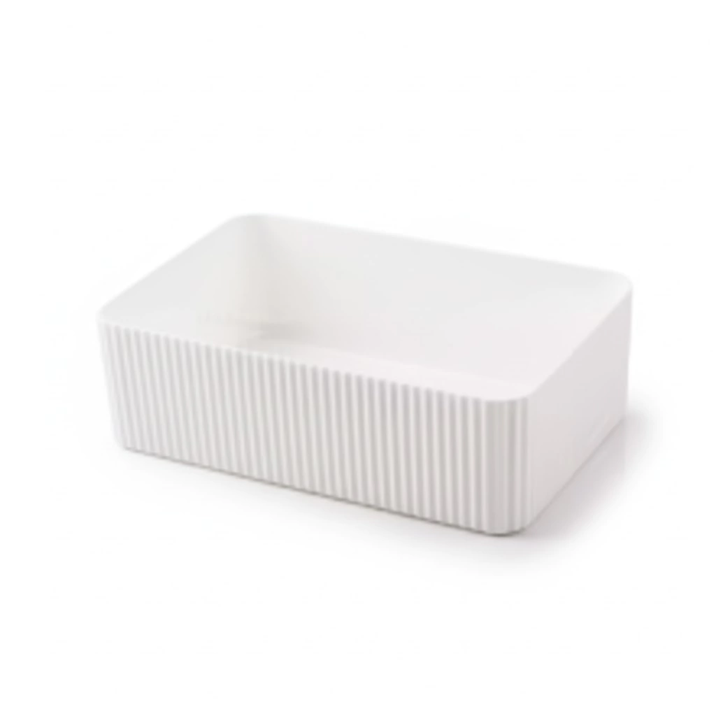 Materiales: Caja organizadora fabricada en plástico rígido de alta calidad, durable y liviano. Presenta un diseño con textura acanalada en el exterior y superficie interna lisa para facilitar la limpieza. Acabado en color blanco mate que aporta un estilo moderno y minimalista.