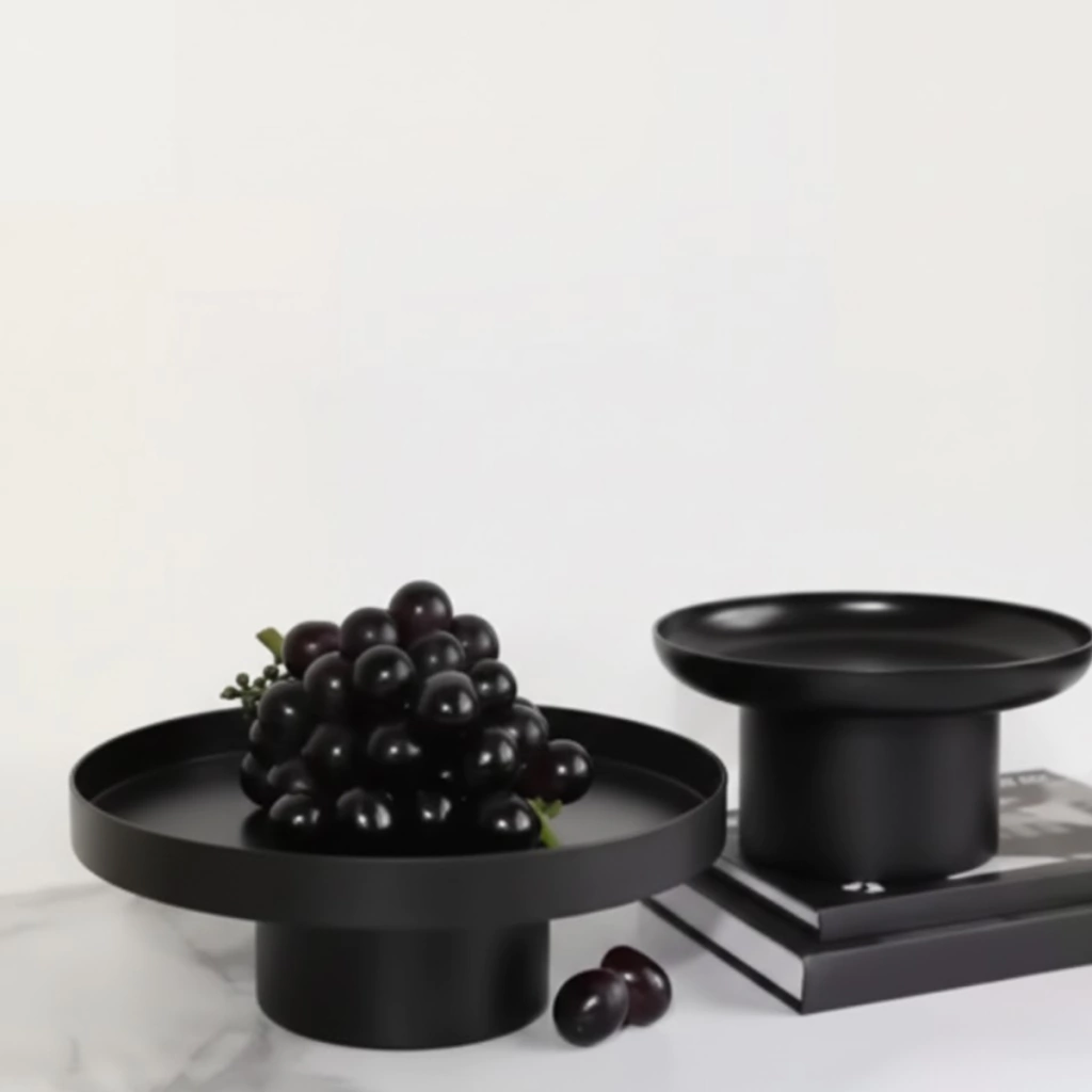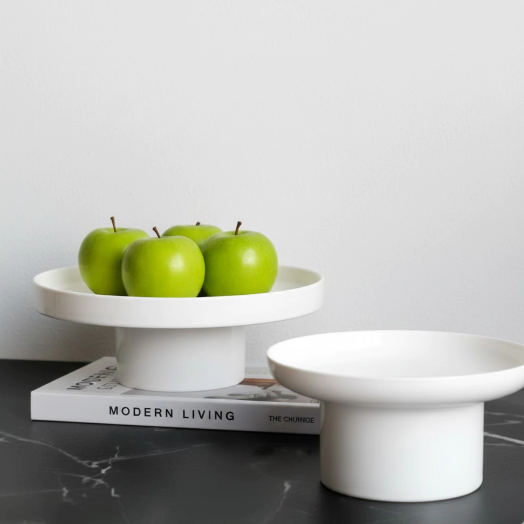 Uso Principal: Ideal como pieza de exhibición para elevar y destacar frutas, postres, o elementos decorativos pequeños. Su diseño monocromático y geométrico le da un aire elegante de pedestal.