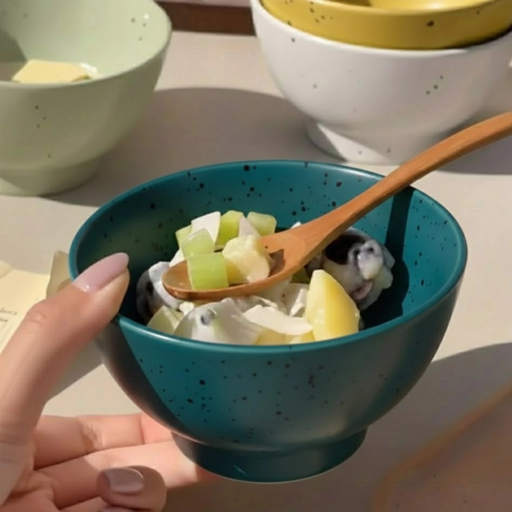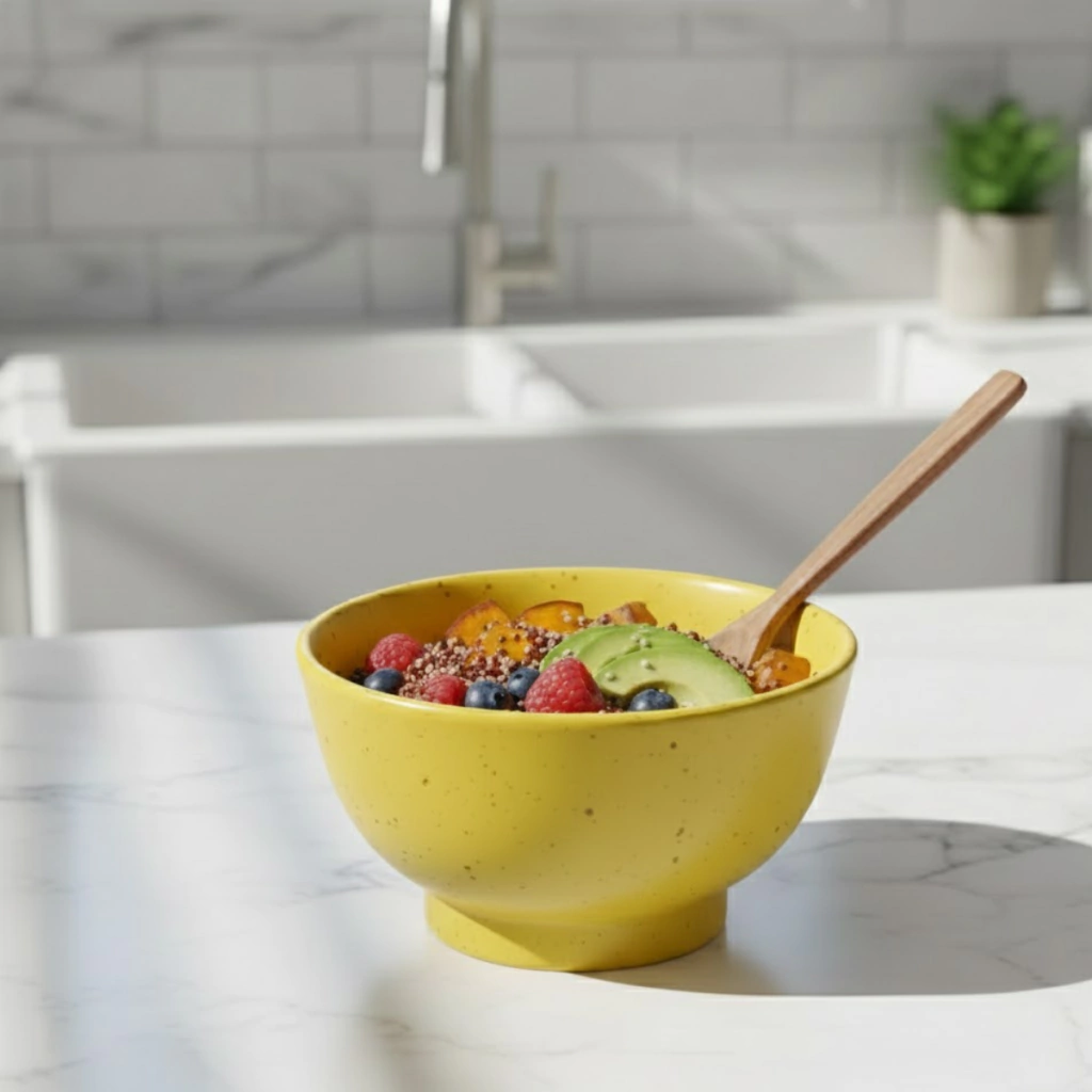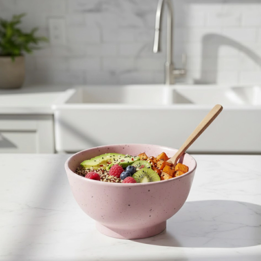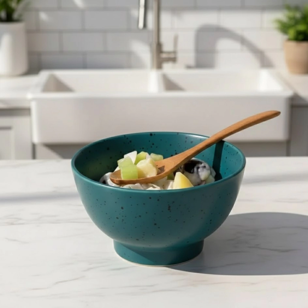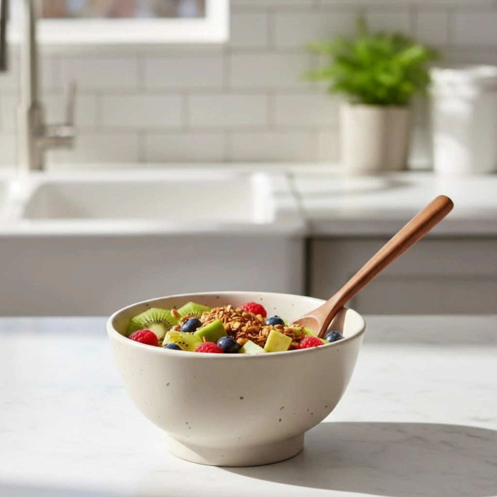 Uso Principal: Ideal para servir desayunos (cereales, yogurt con granola), postres, sopas individuales o ensaladas de frutas (como se muestra en la imagen). Su diseño profundo y su base elevada lo hacen cómodo para sujetar.