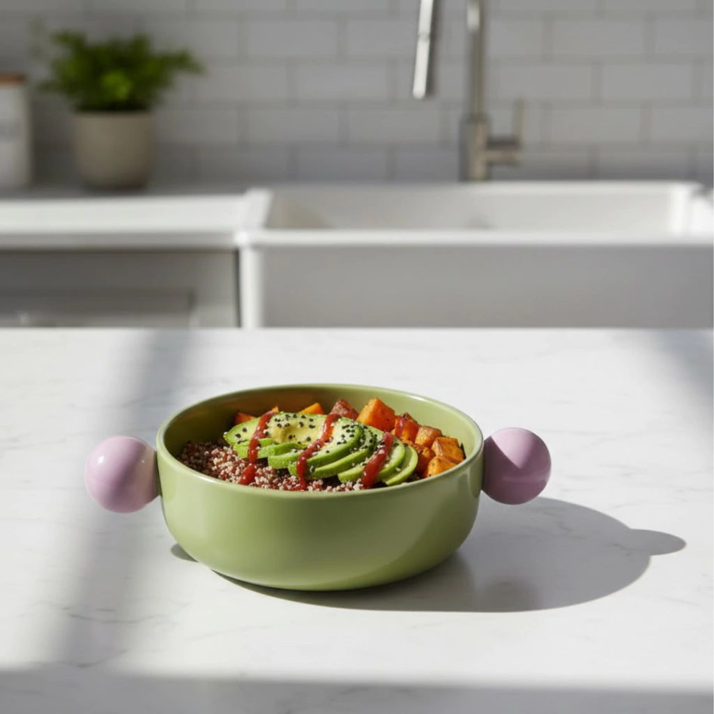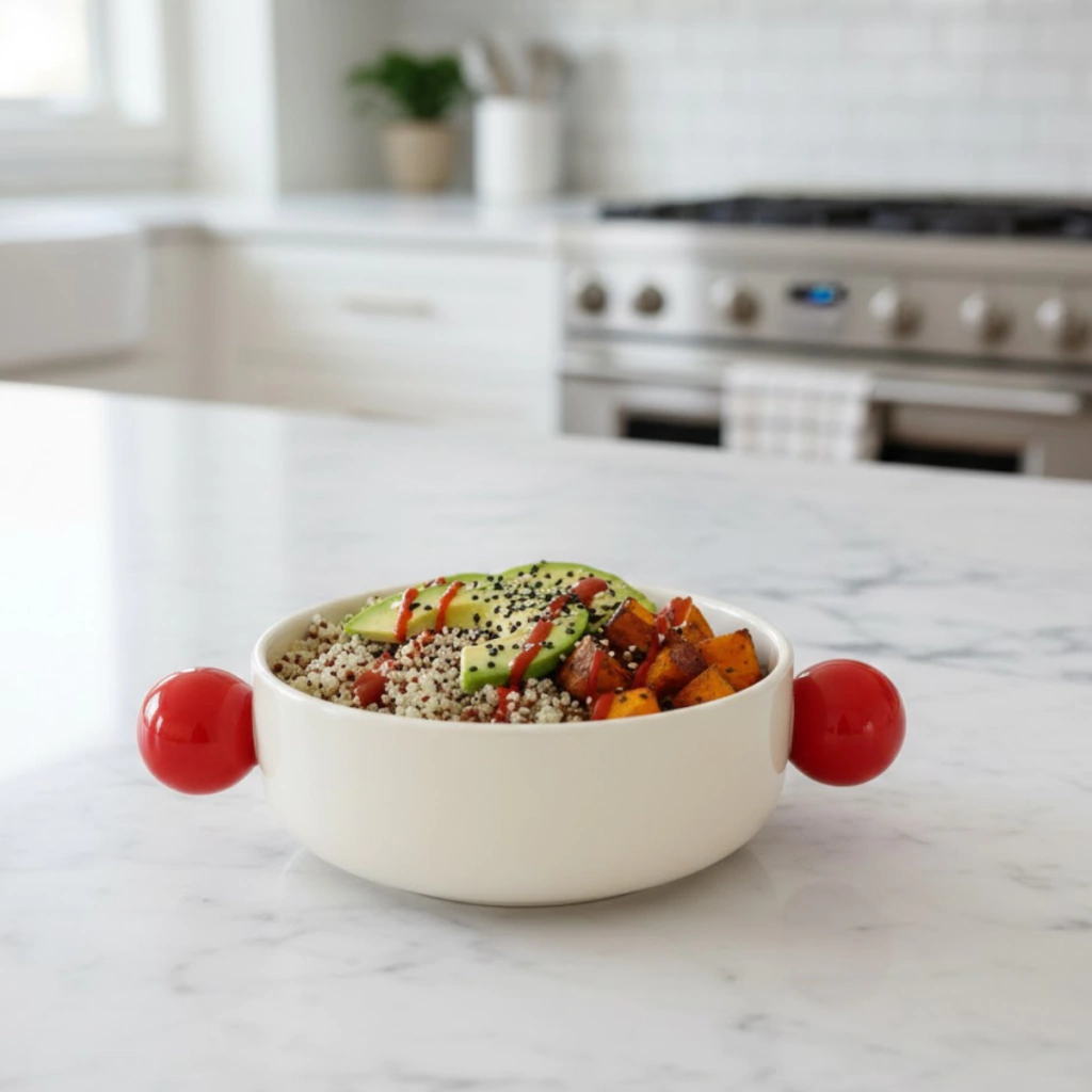 Uso Principal: Ideal para servir platos individuales como bowls de cereales, quinua, ensaladas de grano o sopas. Las asas añaden un toque de color y facilitan el agarre y transporte del tazón.